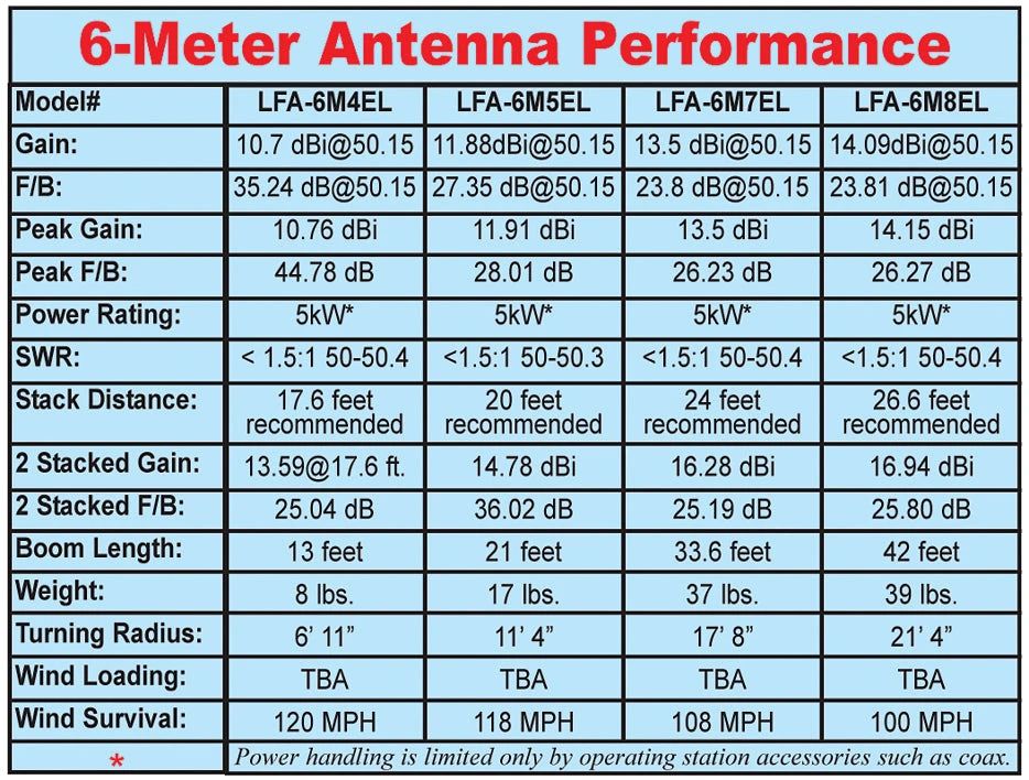 Cushcraft’s direct 50-Ohm feed has no lossy matching network that limits power handling. Cushcraft LFAs handle 5,000 Watts. Your actual operational power is limited by your coax, connectors and other accessories.