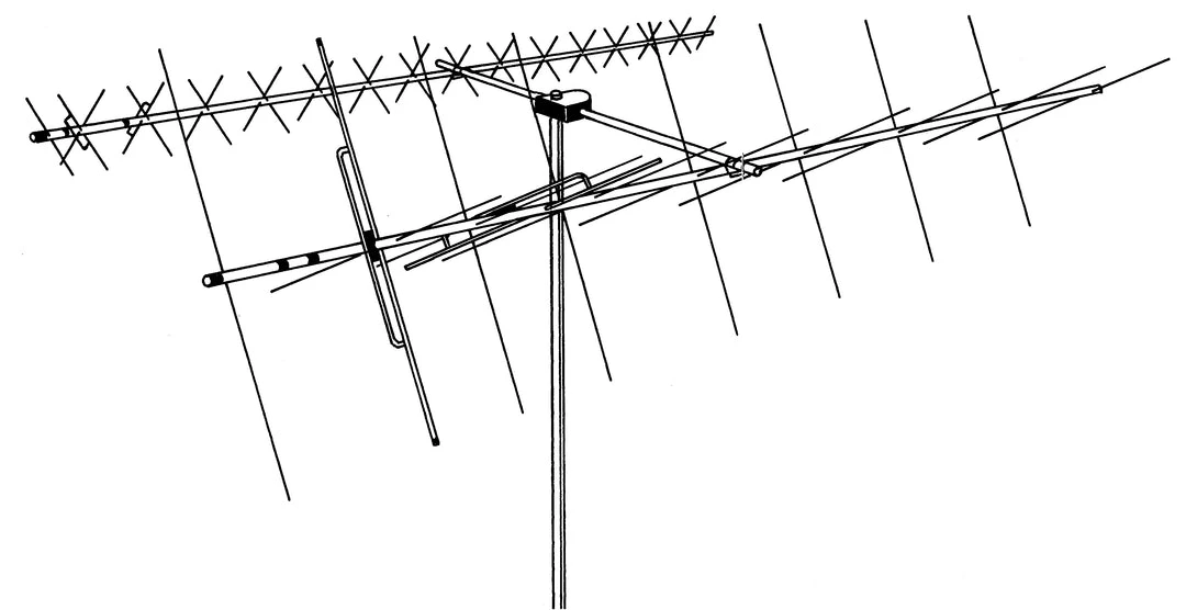 The picture contains the entire DB-218SAT Oscar Link antenna system, including VB-216SAT, UB-7030SAT, and the FB-217SAT The DB-218SAT is a complete 2 Meter/440 MHz Oscar Link antenna system. It contains the crossboom assembly with necessary phasing lines, relays, and hardware. It includes left and right circuitry switching to reduce fading. True RF switching elements are rated at 200 Watts and improved VSWR for higher efficiency. Feed points are encapsulated and weather protected for longer life. Made of fiberglass, the crossboom maintains the integrity of the circularity pattern.