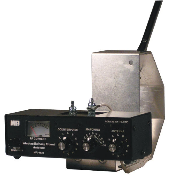 Complete antenna system mounts on window frames, balconies, and railings. Perfect for apartment dwellers. Covers 30-6 Meters. Includes universal mount/clamp, built-in antenna tuner with RF isolator, long 12 foot telescopic whip (22.5 inches collapsed), counterpoise wires, and safety rope. Handles 200 Watts.