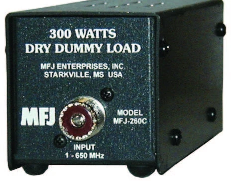 The MFJ-260C is an air cooled, non-inductive resistor in a perforated metal housing. It has SO-239 connectors. You can handle a full load for 30 seconds. Silk-screened derating curve to 5 minutes. Handles 300 Watts. SWR below 1.1:1 to 30 MHz, 1.5:1 from 30 to 650Mhz. It measures a super compact 2 1/4×2 1/4×7 inches.