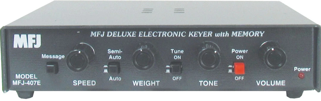 Everything you need to send great CW from this MFJ Cutris Keyer TM — easy access front panel controls, all keyer modes, dot-dash memories, jam-proof spacing, weight control, sidetone, built-in speaker and more. Speed, weight, tone, volume controls, tune, semi-auto and on/off switches are all on the front panel.
