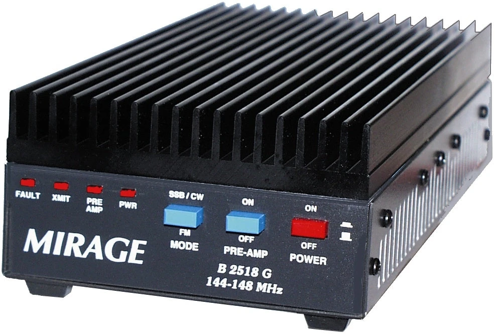MIRAGEs most popular amplifier gives you 160 Watts of output power for just 25 W in from your base/mobile rig! The B-2518-G is ideal for your 20 to 60 Watt 2 Meter mobile or base station. You will talk further, longer, clearer on all modes – FM, SSB, CW- hear weak signals better than youve ever heard before! You get a low noise 20 dB GaAsFET preamp with an excellent 1 dB noise figure for pulling out weak signals. B-2518-G is fully protected with features found in expensive commercial amplifiers. High SWR or excessive input power can damage your amplifier. Protection circuits automatically bypass your amplifier to prevent damage and an LED lights to warn you. An Active-Bias system keeps SSB voice crisp and clear for fantastic operation. Other amplifiers using conventional bias methods tend to produce splatter and distortion as power level changes. This amp with Active-Bias doesnt exhibit the problem. Adjustable time delay gives you smooth transmit/receive switching. Remote external keying. Extra heavy duty custom heatsink spans the entire cabinet. Draws 17 – 22 A from 13.8 VDC. Compact 12″ x 3″ x 5.5″.