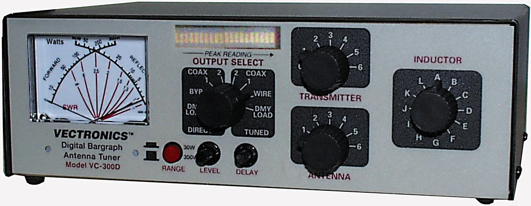 The VC-300D is similar to the VC-300DLP, but it has a 21 segment bargraph display that makes analyzing SSB power easy. LED meter shows peak reading and has fully adjustable level and delay controls. You can tune any real antenna from 1.8 to 30 MHz, including all MARS and WARC bands. Use verticals, dipoles, inverted vees, yagis, quads, long-wires, whips, G5RVs, etc. Has 4:1 balun for balanced line antennas. Handles up to 300 Watts SSB PEP, 200 Watts continuous (150 Watts on 1.8 MHz). The VC-300D backlit Cross-Needle Meter displays SWR, forward and reflected power simultaneously. Reads both peak and average power on 30/300 Watt scales. Meter lamp has front panel switch and uses 12 VDC or 110 VAC with AC-12 adaptor (not Inc.) The VC-300D either position antenna switch lets you select two coax fed antennas, random wire/balanced line or built-in dummy load for use through your tuner or direct to your transceiver. Bypass position bypasses your tuner but keeps your SWR Power meter in line. A built-in 50 Ohm dummy load makes tuning up your rig easy! Use it for testing and repairing your rig, setting power level adjusting your mic gain and more. The finest components available and the highest quality construction gives you the best 300 Watt tuner that you can buy.