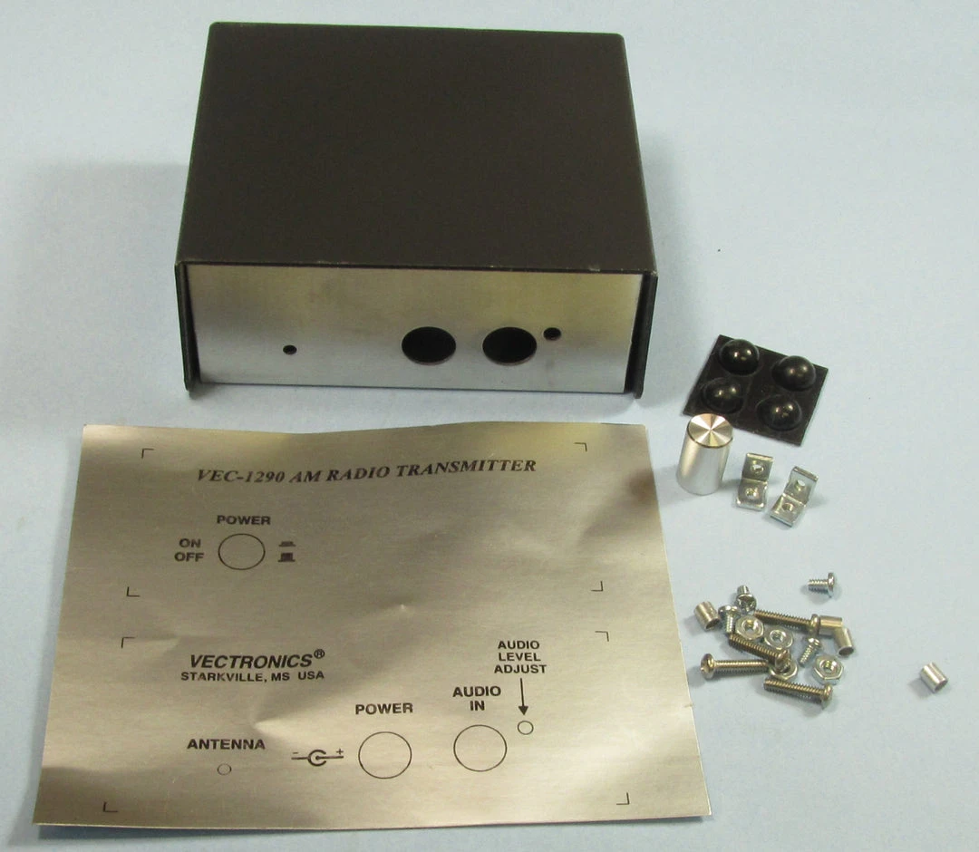 All metal cabinet for AM Radio Transmitter Kit VEC-1290K. Comes complete with knobs, hardware and rubber feet. Has brushed aluminum looking front panel decal.