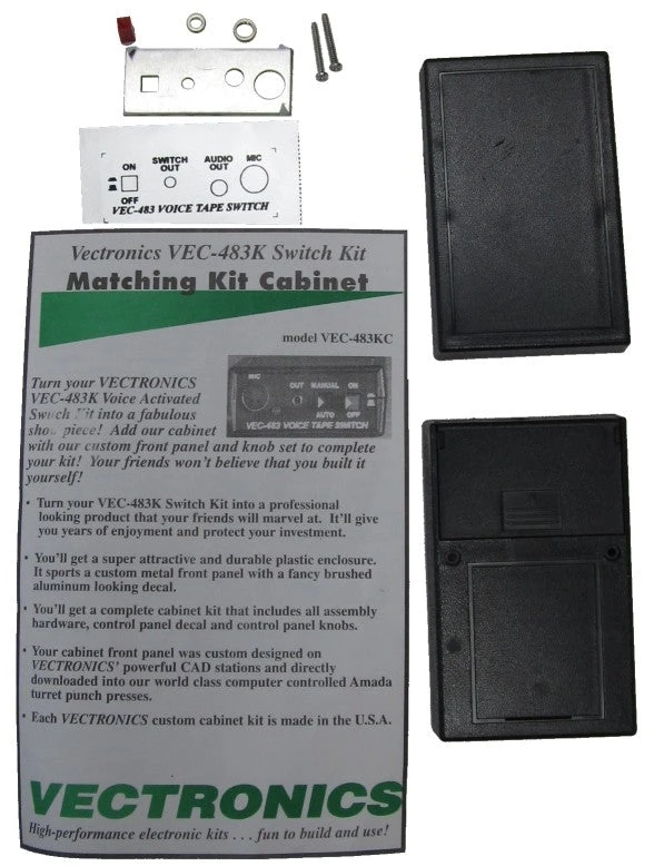 The VEC-483K Electronic Kit lets you remotely and automatically record conversations, speeches and other presentations. It lets you record for longer periods by not recording silence and wasting tape. You simply plug it into the remote jack of a tape recorder and it is activated when it hears speech. The self-contained unit has a built-in microphone and an on/off switch. The kit requires a 9 volt battery (not included).